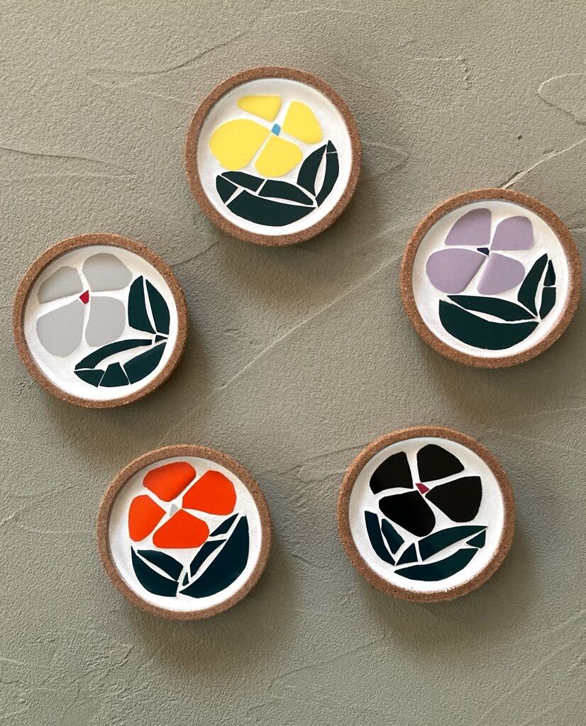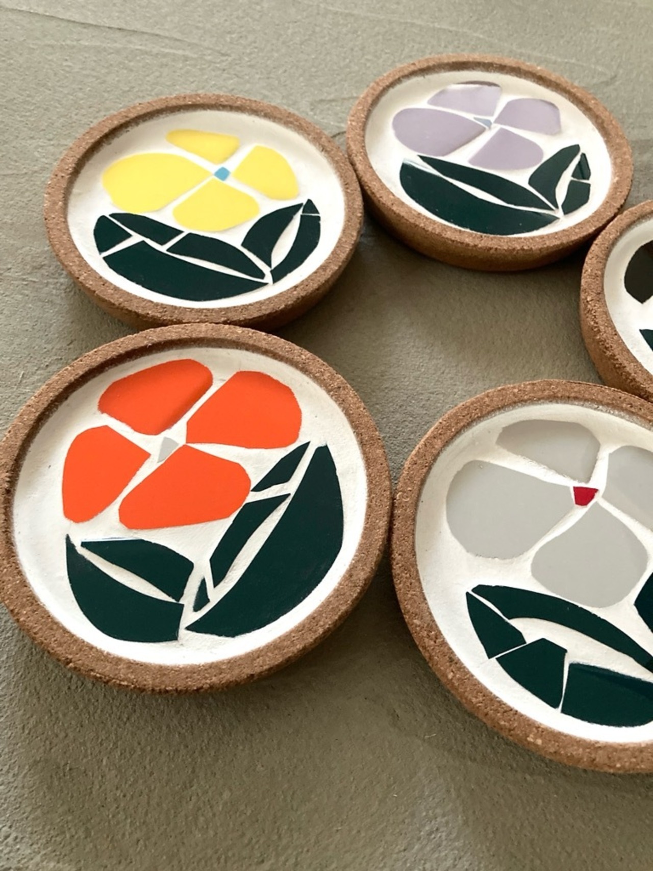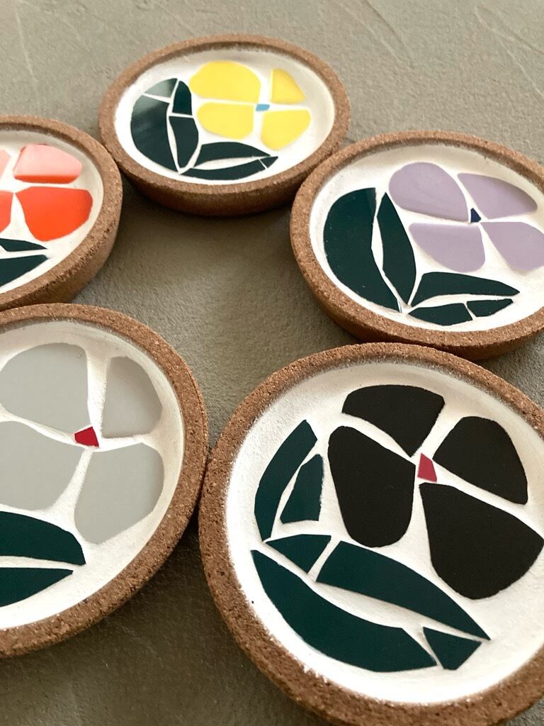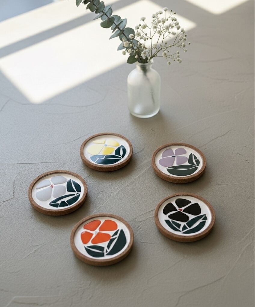 フラワーモチーフのカラフルなモザイクタイルコースター5点セット。