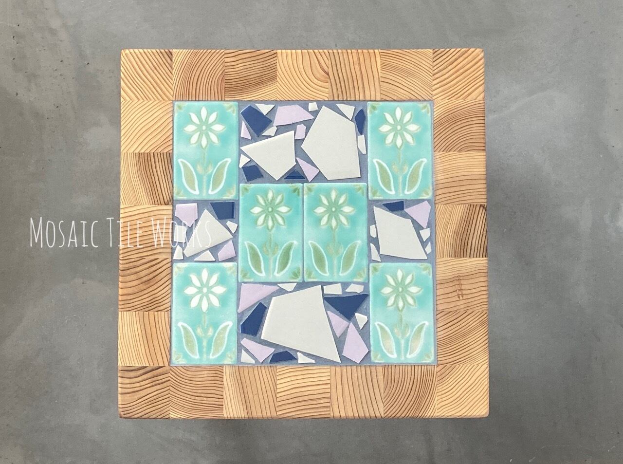 木目が印象的な天板に貴重な日本のレトロタイルとモザイクタイルをミックスした’’HANA’’。