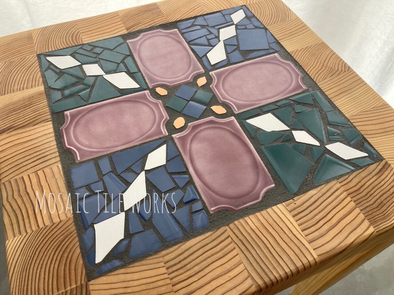 木目が印象的な天板に貴重な淡い色合いの日本のレトロタイルとモザイクタイルをミックスした”モダンレトロ”。